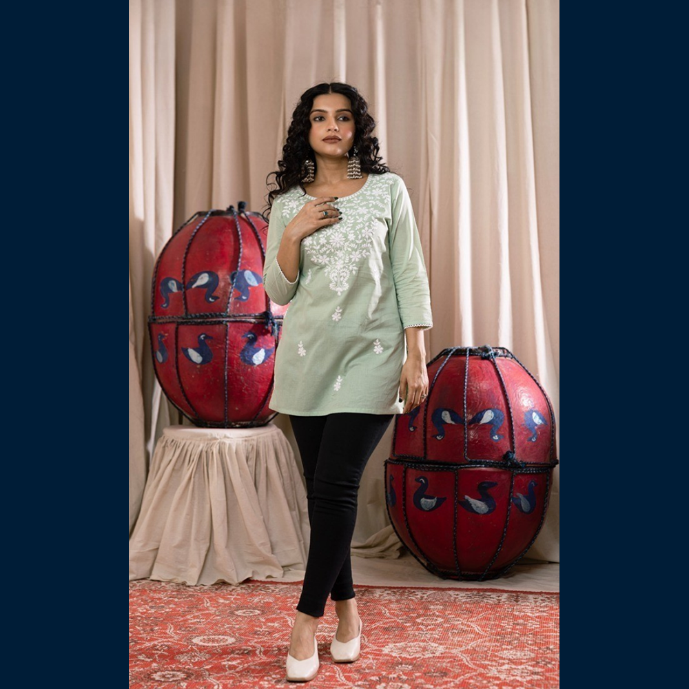💚 Elegant pastel sage green embroidered top with minimal floral detailing