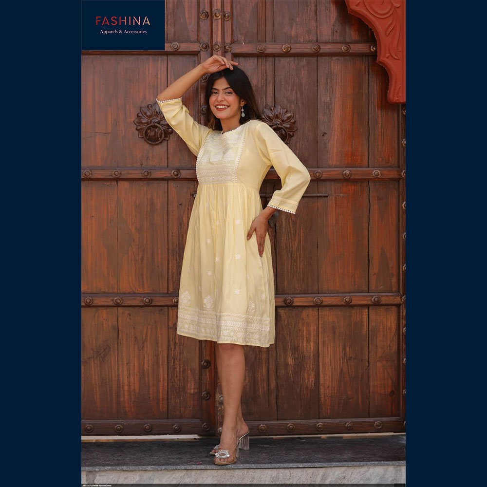 🌕 Soft pastel yellow hue with elegant white embroidery