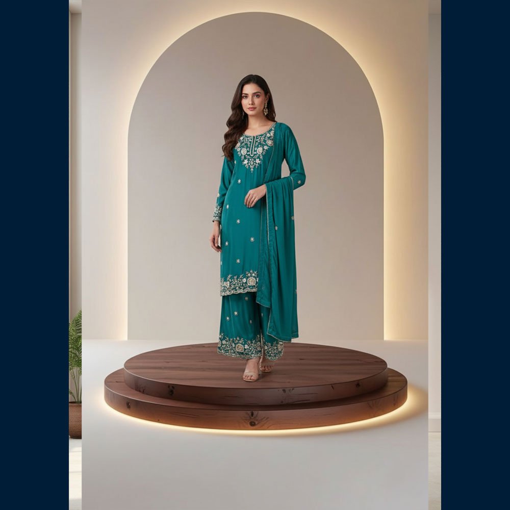 Rich teal kurta set adorned with intricate golden threadwork for a luxurious festive look ✨