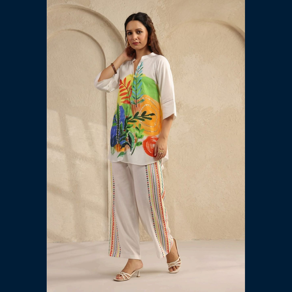 A vibrant hand-painted inspired co-ord set splashed with tropical leaves, bold strokes, and sunset hues 🌿🎨