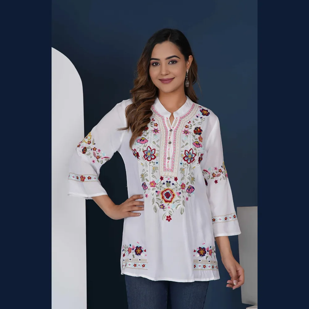 • 🤍 Elegant white base with vibrant multicolor floral embroidery